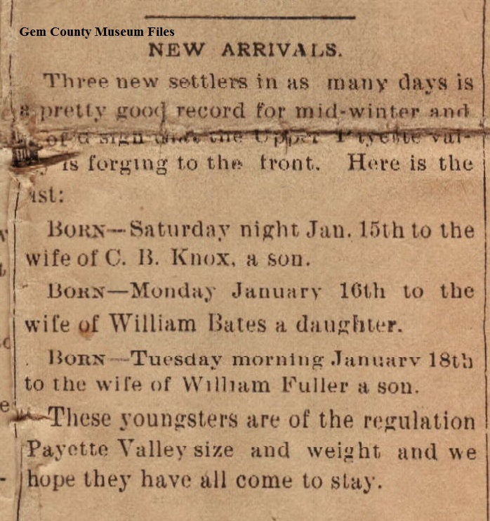 New Arrivals - Son born to C. B. Knox, daughter to William Bates, son to William Fuller